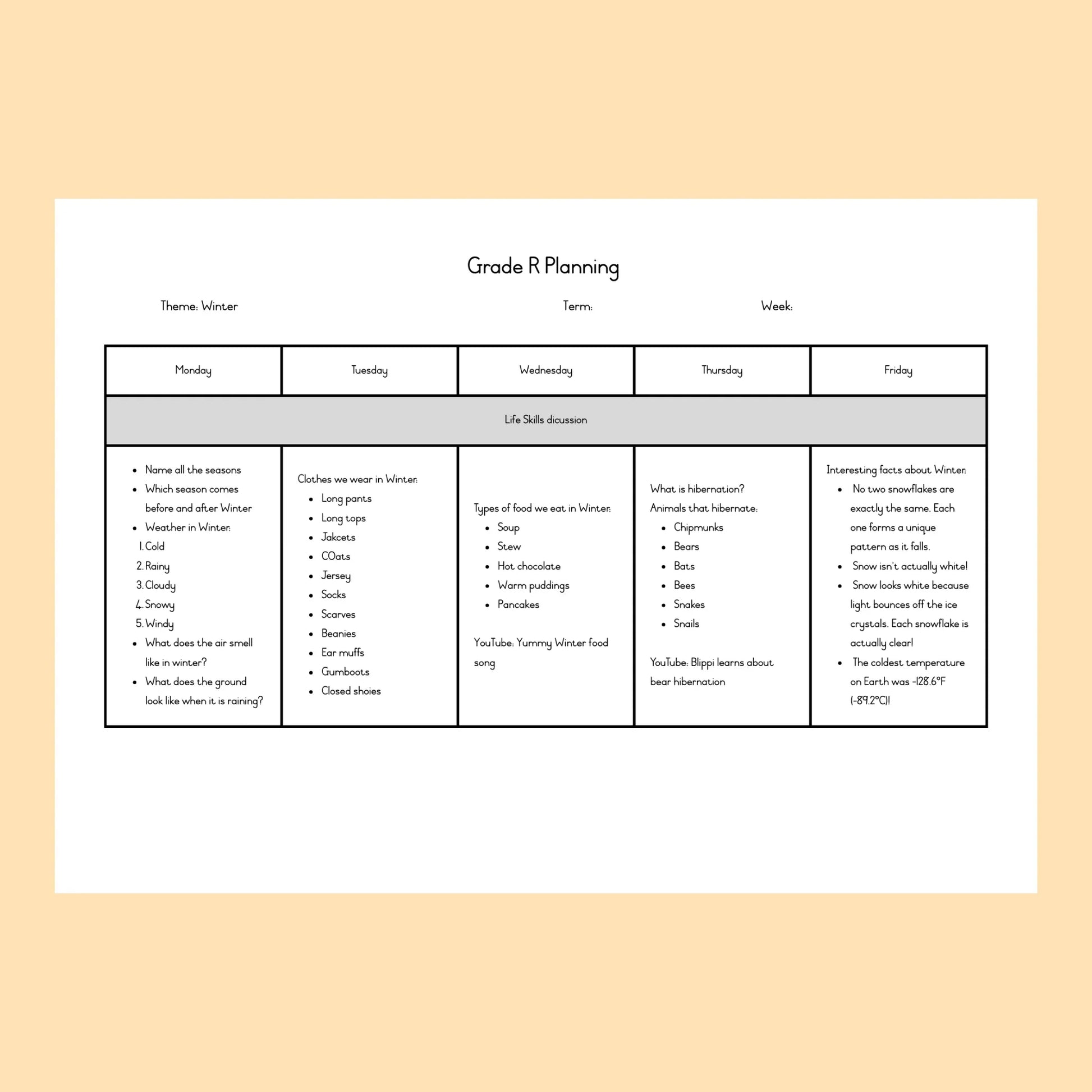 Engaging and age-appropriate Grade R lesson plans designed to support early learning through fun, hands-on activities. Perfect for building foundational skills in language, math, and life skills. Easy to follow and ideal for teachers or homeschooling parents.